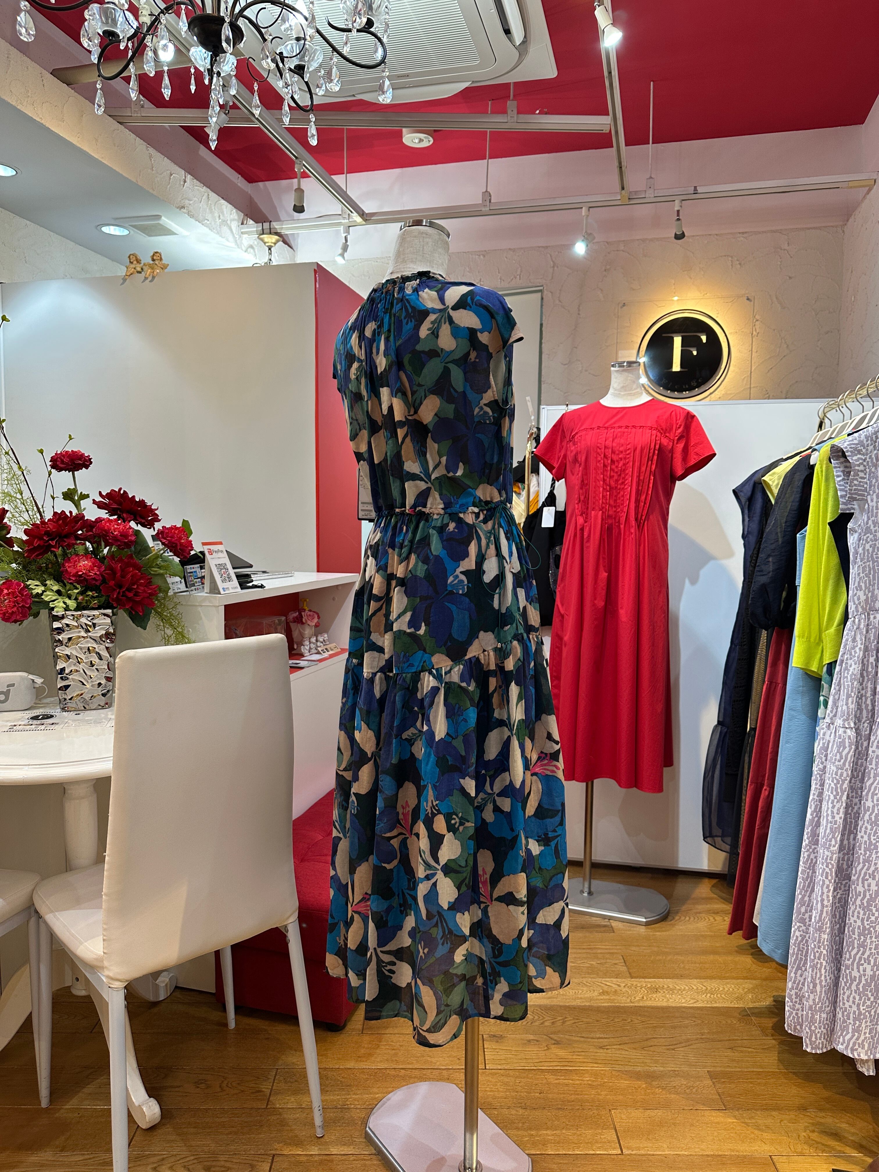 ブルー系の柄ワンピースは色がちょっと抑えめなので、派手過ぎず地味過ぎず!
